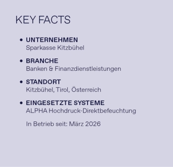 Die Hochdruck Direktbefeuchtung sorgt für eine gleichmäßige, angenehme Luftfeuchtigkeit in den Büro‑ und Beratungsräumlichkeiten der Sparkasse Kitzbühel und trägt maßgeblich zu einem verbesserten Arbeits‑ und Aufenthaltsklima bei.
